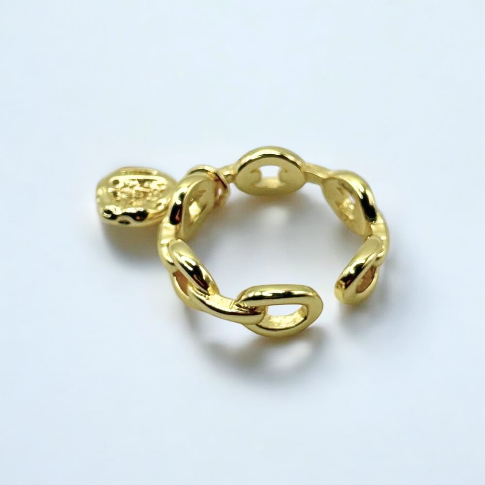 コインチャームが揺れるこのチェーンリングは、クラシカルなデザインと遊び心のあるディテールが融合したエレガントなアクセサリーです。