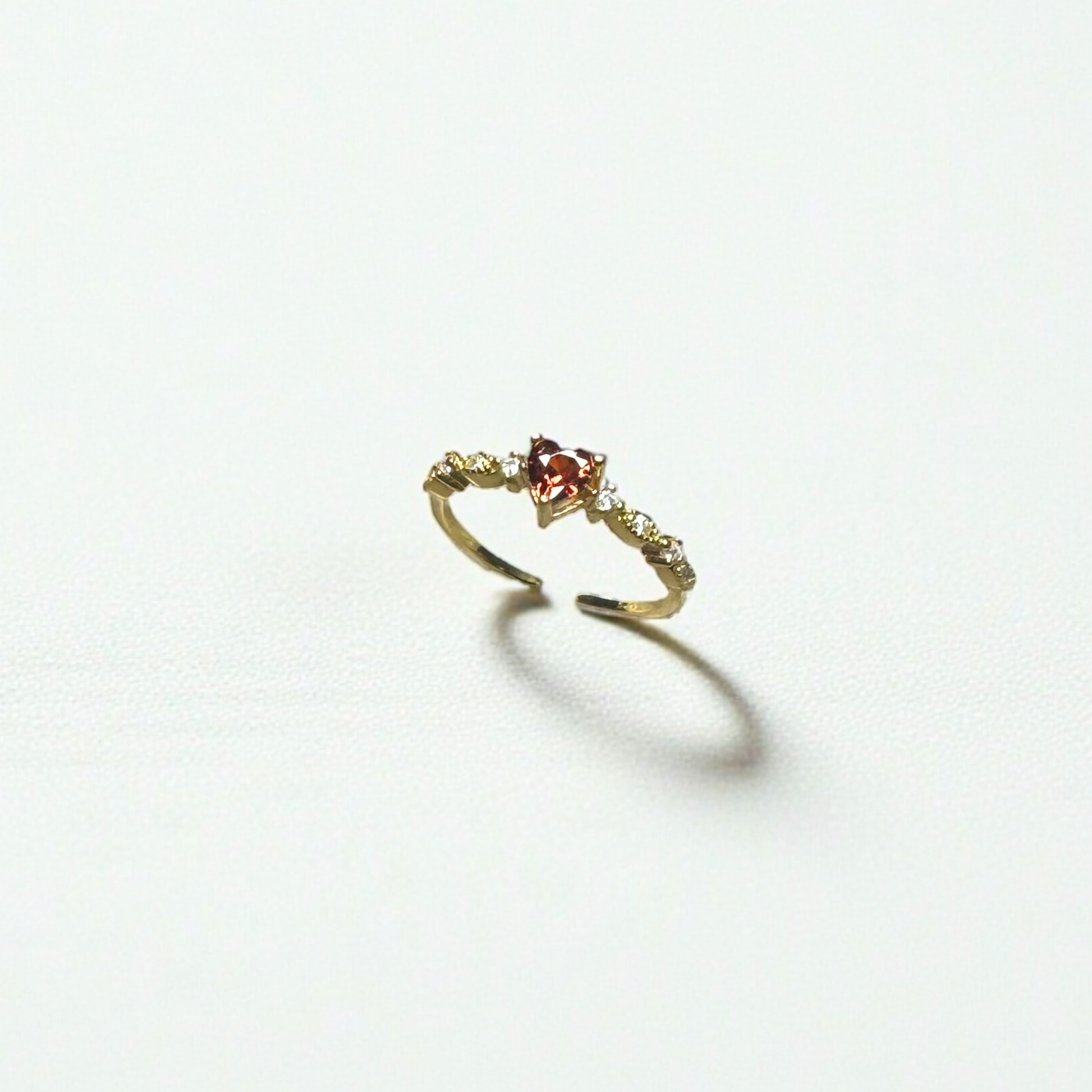 赤いハートのストーンが、指先で静かに輝くオープンリング。