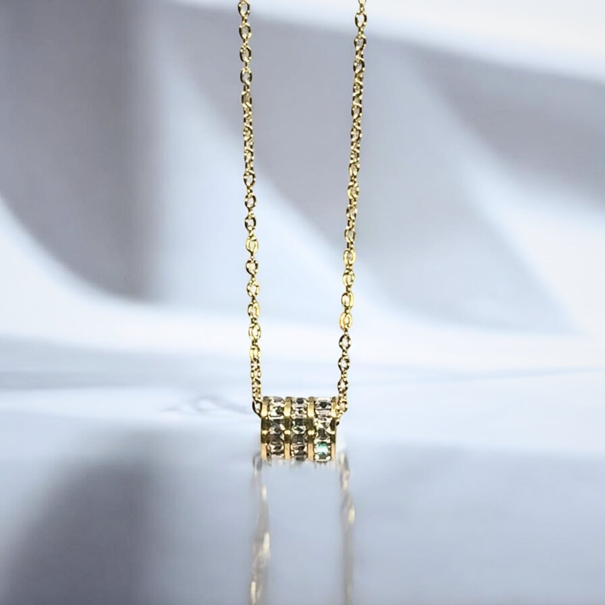 3列にジルコニアが埋め込まれたバレル型チャームが印象的なステンレス製ネックレス。