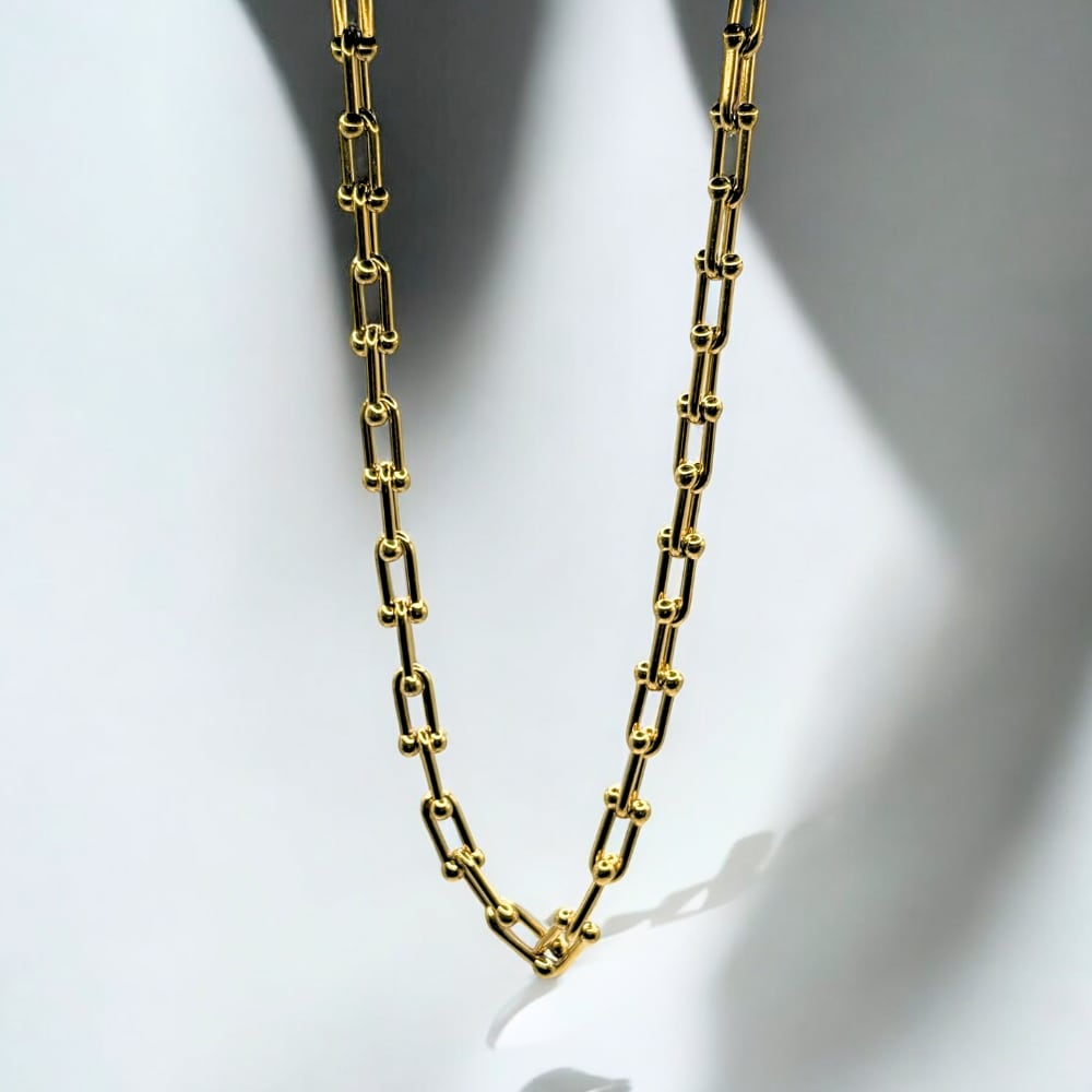 このネックレスは、洗練されたデザインとモダンなリンクチェーンが特徴的な一品です。